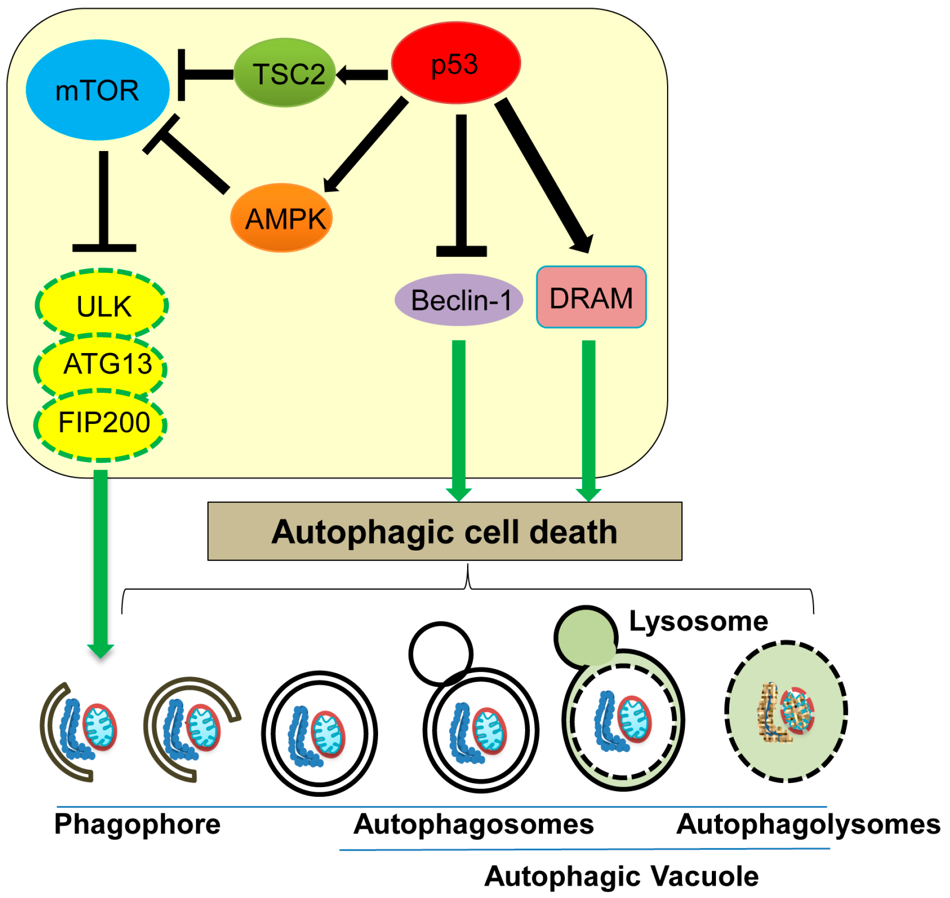 Autophagic cell death and its regulation by p53. Nuclear p53 induces autophagic cell death by transcriptionally upregulating tuberous sclerosis (TSC2), AMP-activated protein kinase (AMPK), and damage-regulated autophagy modulator (DRAM), whereas cytoplasmic p53 inhibits autophagic cell death by inducing Beclin-1 degradation. mTOR: mammalian target of rapamycin.