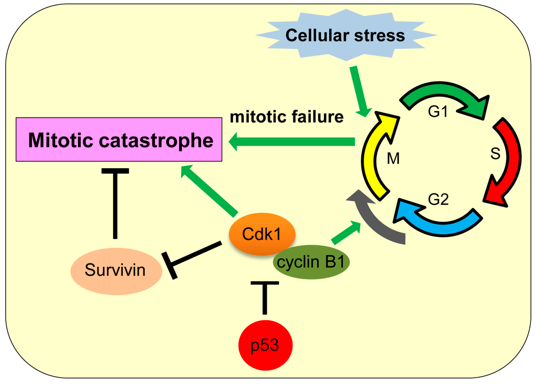 The inhibitory role of p53 in mitotic catastrophe has been reported. p53 inhibits transcription of cdk1 and cyclin B1, hence inhibiting mitotic catastrophe (Figure 5) [123,124]. p53 also upregulates expression of cdk1 inhibitors, including 14-3-3σ, p21, and GADD45 (growth arrest and DNA damage-inducible 45) [125,126,127,128]. Thus, p53 inhibits mitotic catastrophe in multiple ways. It is also shown that mitotic catastrophe occurs predominantly in p53-null cells due to aneuploidy and genomic instability [129]. However, there is a report showing that p53 can transcriptionally repress survivin [130]. Future studies need to clarify whether the inhibitory effect of p53 on survivin levels could promote mitotic catastrophe in some cellular contexts.