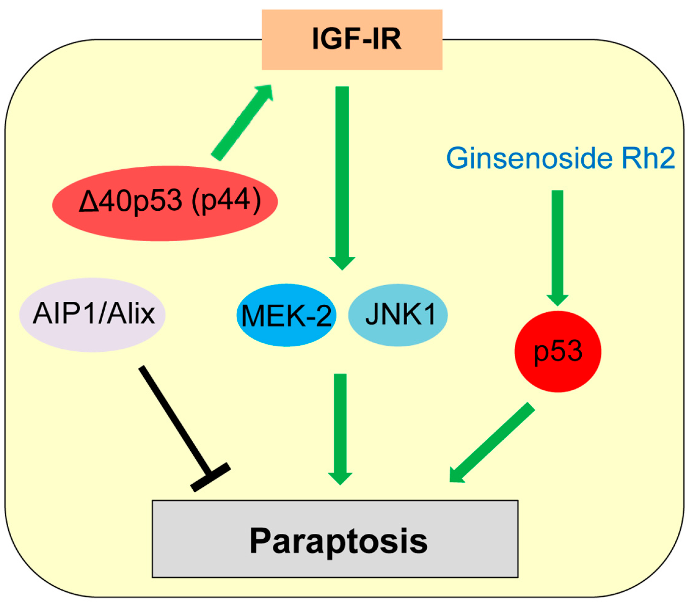 Only a few studies show potential association of p53 with paraptosis. Treatment with ginsenoside Rh2, one of the active principles of Panax ginseng root, induces cell death by both apoptosis and paraptosis, in a p53-dependent manner [138]. Pehar et al. [139] report that mice expressing Δ40p53 (p44), a N-terminal region lacking isoform of p53, show neurodegeneration and premature death caused by paraptosis and autophagic cell death, due to elevated hyperactive IGF-IR signaling (Figure 6). However, p53 is also reported to inhibit the IGF-IR signaling by decreasing the IGF-IR promoter activity and upregulating IGF-BP3 expression [140,141]. Future investigations are required for clarifying the role of p53 in paraptosis induction.