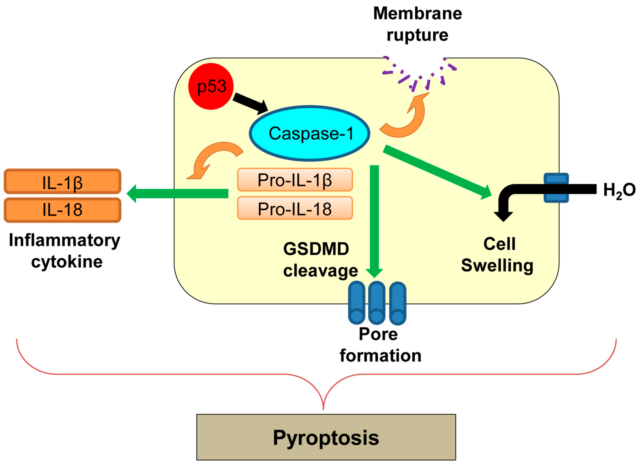 There is no direct evidence showing correlation of p53 with pyroptosis. In addition, Hilbi et al. [148] show that Shigella infection-induced caspase-1-mediated cell death in macrophages is p53-independent. However, p53 transcriptionally upregulates caspase-1 [149]. Further studies are required to determine whether regulation of caspase-1 by p53 could induce pyroptosis in different cellular contexts.