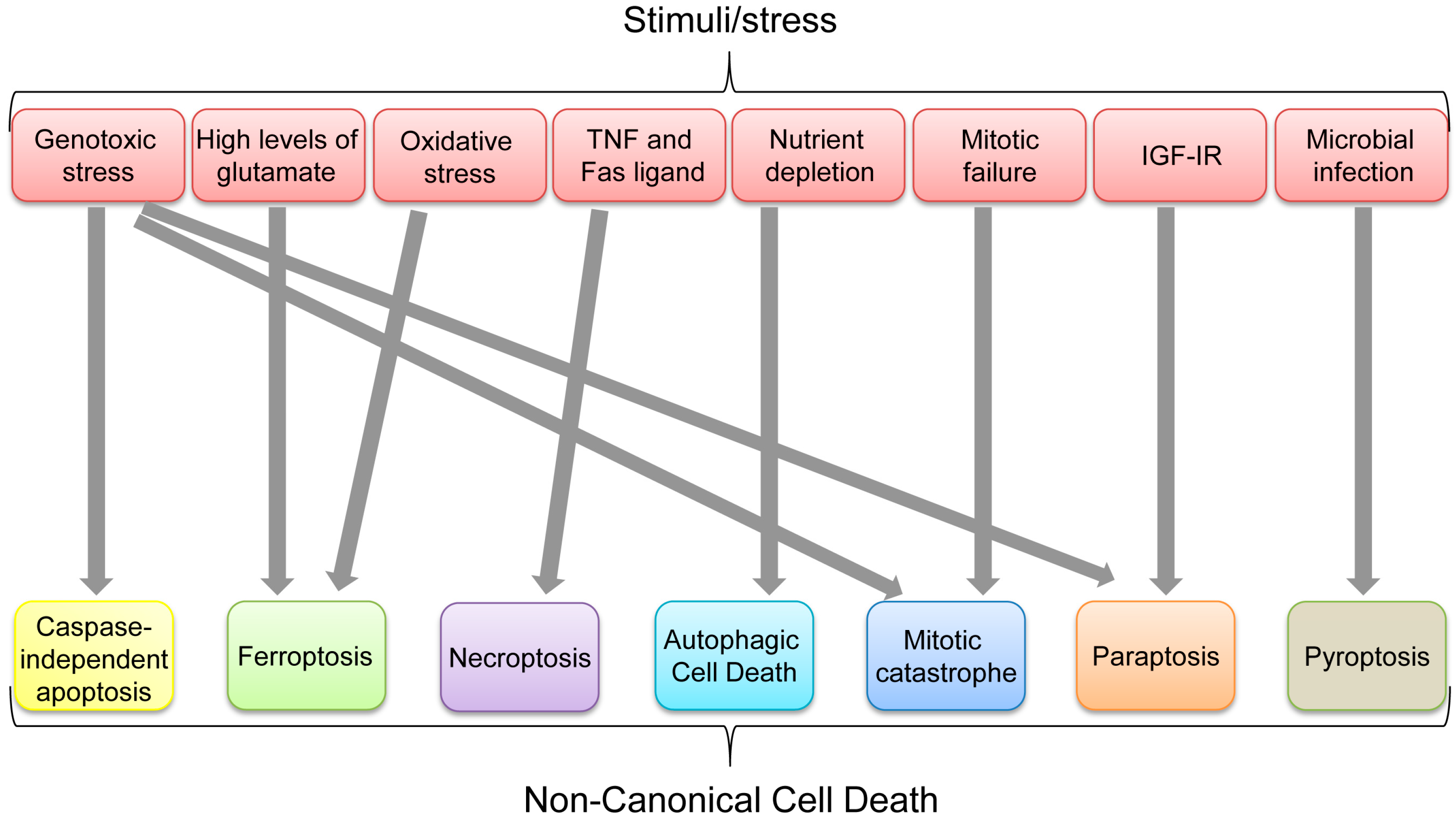 Different types of non-apoptotic cell death have been identified through recent studies in various species including Caenorhabditis elegans, Drosophila melanogaster, humans, and other multicellular organisms [18,19]. These non-canonical cell death mechanisms include caspase-independent apoptosis (CIA), ferroptosis, necrosis, autophagy, mitotic catastrophe, paraptosis, and pyroptosis (Table 1). They are different in the causative factors, morphological features, and proteins or pathways involved [18]. Many of these non-apoptotic non-canonical cell death pathways are independent of caspases that are used for apoptosis induction [18,19]. These cell death machineries could be used as secondary modes of cell death when apoptosis fails [20].