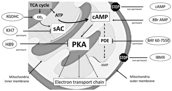 - Acin-Perez, R.; Salazar, E.; Kamenetsky, M.; Buck, J.; Levin, L.R.; Manfredi, G. Cyclic AMP produced inside mitochondria regulates oxidative phosphorylation. Cell Metab. 2009, 9, 265–276. [Google Scholar] [CrossRef] [PubMed]