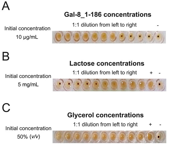 Gal-8_1-186 induces chicken erythrocyte agglutination assay. (A) Gal-8_1-186 induce agglutination of chicken erythrocytes with a MAC (Minimum Agglutination Concentration) value of 0.16 µg/mL. “−”represents the negative control well containing no protein; (B) the agglutination capability of Gal-8_1-186 was inhibited by lactose. 0.16 µg/mL Gal-8_1-186 was used in this assay. The MIC (Minimum Inhibition Concentration) of lactose is 0.63 mg/mL. “−”represents the negative control well containing no protein and lactose; “+”represents the positive control well containing no lactose; (C) the agglutination capability of Gal-8_1-186 was inhibited by glycerol. 0.16 µg/mL Gal-8_1-186 was used in this assay. Glycerol cannot inhibit the agglutination activity of Gal-8_1-186 even at 50% (v/v) concentrations. “−” represents the negative control well containing no protein and glycerol; “+” represents the positive control well containing no glycerol.