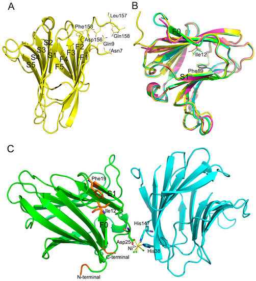 In structures 4 and 5, Ni2+ formed a complex with Asp25 and His38, His147 from another Gal-8N molecule, along with three water molecules (Figure 3C). In contrast in structures 1 to 3, no divalent caution was observed at this position. In a previously reported structure, Zn2+ was found at the same position as Ni2+ in the crystal structure with space group P43212 [32]. Asp25 is close to β-strand S1, and coordination between Asp25 and Ni2+ may impact on S1. Therefore, S1 may induce Gln9 to Ile12 to form a β-strand from Ile12 to Phe19 via van der Waals forces.