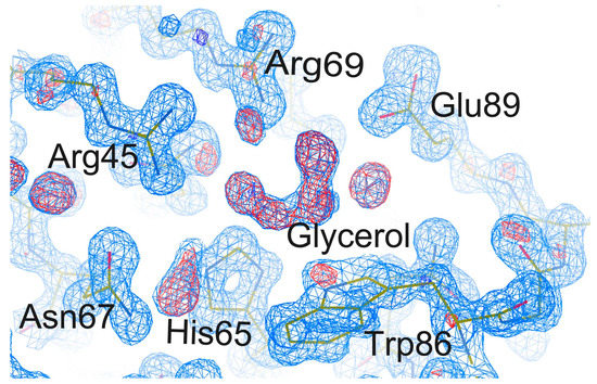 Electron density map of the carbohydrate binding site binds to glycerol in structure 1 (PDB code: 5GZC) of Gal-8_1-186. The 2|Fo| − |Fc|, αc map contoured at 1δ is shown as blue density and the |Fo| − |Fc|, αc map contoured at 3δ is shown as red density.