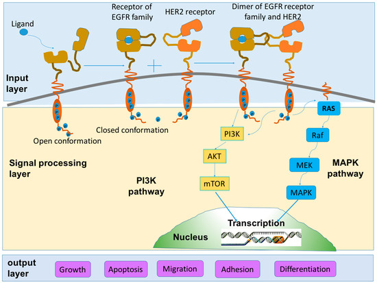 Schematic diagram of HER2 signaling pathways. Upon ligand binding, dimerization between receptors of EGFR family and HER2 receptor is induced. The homodimers or heterodimers thereafter stimulate a serial of signaling cascades. Among various signaling pathways, the phosphatidyl inositol 3-kinase (PI3K) and mitogen-activated protein kinase (MAPK) pathways are the two major and most studied pathways which take a pivotal role in tumor proliferation and anti-apoptosis. The whole signal transduction process can be divided into three sections: signal input (ligand-binding and dimerization), signal processing (a series of signaling cascades) and signal output (corresponding cellular processes). The scheme is modified based on two works contributed by Yarden et al. [15] and Tai et al. [16], respectively.