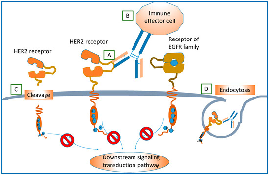 The mechanisms through which trastuzumab exerts its effects are not completely clear, but it is believed to be involved in the prevention of the formation of HER2-containing heterodimers, antibody-dependent cell-mediated cytotoxicity (ADCC), disruption of downstream signaling pathways, inhibition of cleavage of HER2, and promoting endocytosis of HER2 receptors [59,60]. These possible mechanisms of action of trastuzumab on HER2 are shown in Figure 5.