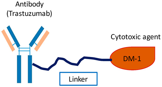 Ado–trastuzumab emtansine (T-DM1, Genentech) is an ADC which was approved by the FDA in 2013 [92]. The structure of T-DM1 is presented in Figure 9. Via a stable thioether linker, T-DM1 can be selectively delivered into tumor cells with HER2 overexpression. After a series of steps, the DM1 can be liberated in the cytoplasm, resulting in cell cycle arrest and apoptosis [93,94,95].