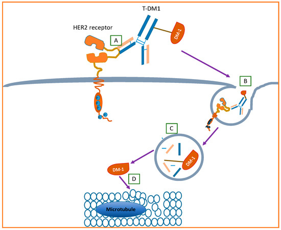 Potential action mechanism of T-DM1. (A) Trastuzumab specifically recognizes and binds to extracellular domain of HER2; (B) induced passive endocytosis of the formed complex of trastuzumab and HER2; (C) the complex may undergo a degradation process to separate the DM-1 from the complex; and (D) the liberated DM-1 exerts its cytotoxicity on the microtubule. Modified based on the work contributed by Martinez et al. [94].