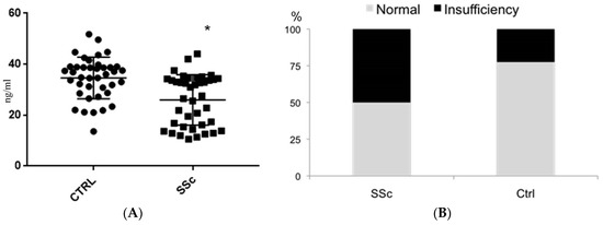 (A) The 25(OH)D3 serum levels in systemic sclerosis and control groups. * p = 0.0003; (B) Prevalence of 25(OH)D3 insufficiency in systemic sclerosis and control groups. p = 0.02.