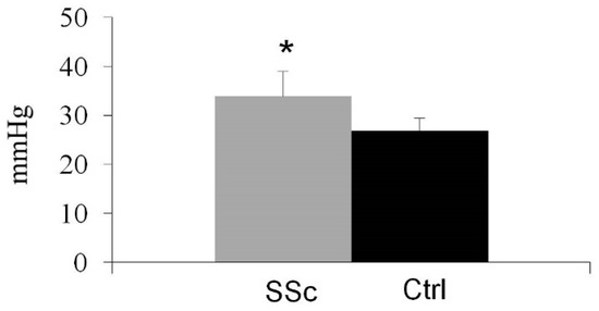 sPAP measurements in SSc and control groups. * p = 0.013.