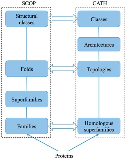 Multiple database sources are often used in protein structure research. These databases include PDB [14]; Universal Protein Resource [15]; Database of Secondary Structure of Protein (DSSP) [16]; Structural Classification of Proteins (SCOP) [17]; SCOP2 (a successor of SCOP) [18]; and Class, Architecture, Topology, Homology (CATH) [19] (Table 1). Among these databases, SCOP and CATH have become valuable resources in protein fold recognition research. Figure 1 shows the architectures of these databases. These databases are detailed below.