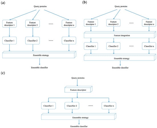 Most of the recently developed methods for protein fold recognition are based on ensemble classifier models. Figure 3 shows the three general types of ensemble classifier models. For given n different single basic classifiers, the first type of ensemble classifier-based methods use one specific feature descriptor to encode query proteins with feature representations (Figure 3a); the feature representations are trained with each single basic classifier to create n single classifier models, and then all of the n trained single classifier models are combined with ensemble strategies to generate an ensemble classifier-based model. For a given n different single basic classifiers and n different feature descriptors, the second type of ensemble classifier-based methods use n feature descriptors to encode query proteins with n different feature representations (Figure 3b); the n feature representations are sequentially combined as one to train the n single basic classifiers, and then all of the n trained single classifier models are combined with ensemble strategies to generate an ensemble classifier-based model. For a given specific classifier and n different feature descriptors, the third type of ensemble classifier-based methods use n feature descriptors to encode query proteins with n different feature representations (Figure 3c); the n feature representations are respectively trained with a specific single classifier to construct n single classifier-based models, and then all of the n trained single classifier models are combined with ensemble strategies to generate an ensemble classifier-based model. This section highlights some representative ensemble methods used in protein fold recognition.