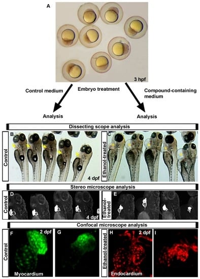 Advantages of use of zebrafish in cardiotoxicity research, which provide enormous information within a short time. (A) Dissecting microscope image of 3 hpf zebrafish embryos showing how easily accessible zebrafish embryos are to treat with chemicals at different developmental stages for desired periods; (B,C) Dissecting microscope images showing normal pericardium in the control embryos (yellow arrow) (B) and pericardial edema phenotype in 4 days post-fertilization (dpf) ethanol-treated zebrafish embryos (yellow star) to help predict defective cardiogenesis (C); (D,E) Bright field images of Tg(myl7:GFP) embryos showing normal shaped two-chambered heart in control (D) and an almost linear heart in ethanol-exposed embryos (E), confirming heart malformation after ethanol exposure; (F,G) Confocal images of Tg(myl7:nlsKiKGR) embryos showing nuclei of cardiomyocytes in closely apposed bean-shaped atrium and ventricle in control embryos (F), fewer cardiomyocytes are seen in misshapen chambers of ethanol-treated embryos (G); and (H,I) Confocal images of Tg(fli1:EGFP) embryos show endocardial cells in normal endocardium in control embryos (H), fewer endocardial cells are seen in misshapen endocardium of ethanol-treated embryo (I).