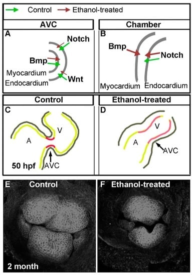 - Sarmah, S.; Muralidharan, P.; Marrs, J.A. Embryonic ethanol exposure dysregulates Bmp and Notch signaling, leading to persistent atrio-ventricular valve defects in zebrafish. PLoS ONE 2016, 11, e0161205. [Google Scholar] [CrossRef] [PubMed]