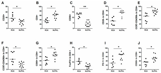 Comparison of cell populations in RLN and NLPHL. Median percentage of each group and significant changes according to p-value (0.001 < * <0.01, ** < 0.001) are indicated in each graph. Main cell populations of (A) CD20+; (B) CD4+ and (C) CD56+ cells. Subpopulations (D) CD26- in CD4+ cells; (E) CCR7-CD45RA- in CD4+ cells; (F) CCR7-CD45RA+ in CD4+ cells; (G) CD69+ in CD4+ cells; (H) FoxP3+ in CD4+ cells; (I) PD-1+ in CD4+ cells; and (J) CD69+ in CD8+ cells.
