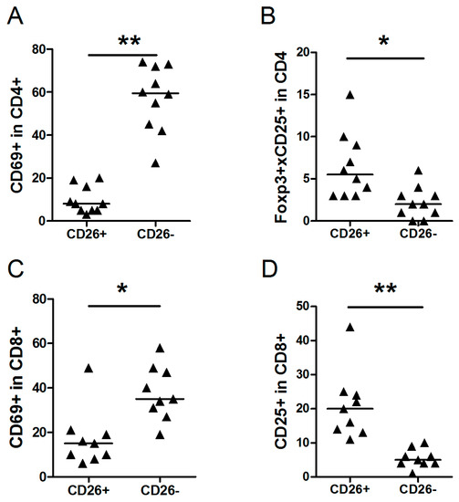 Comparison of cell populations in CD26+ and CD26- cells in NLPHL cases. Median percentage of each group and significant changes according to p-value (0.001 < * < 0.01, ** <0.001) are indicated in each graph. (A) CD69+ in CD4+ cells; (B) Foxp3+CD25+ in CD4+ cells CD4+; (C) CD69+ in CD8+ cells; and (D) CD25+ in CD8+ cells.