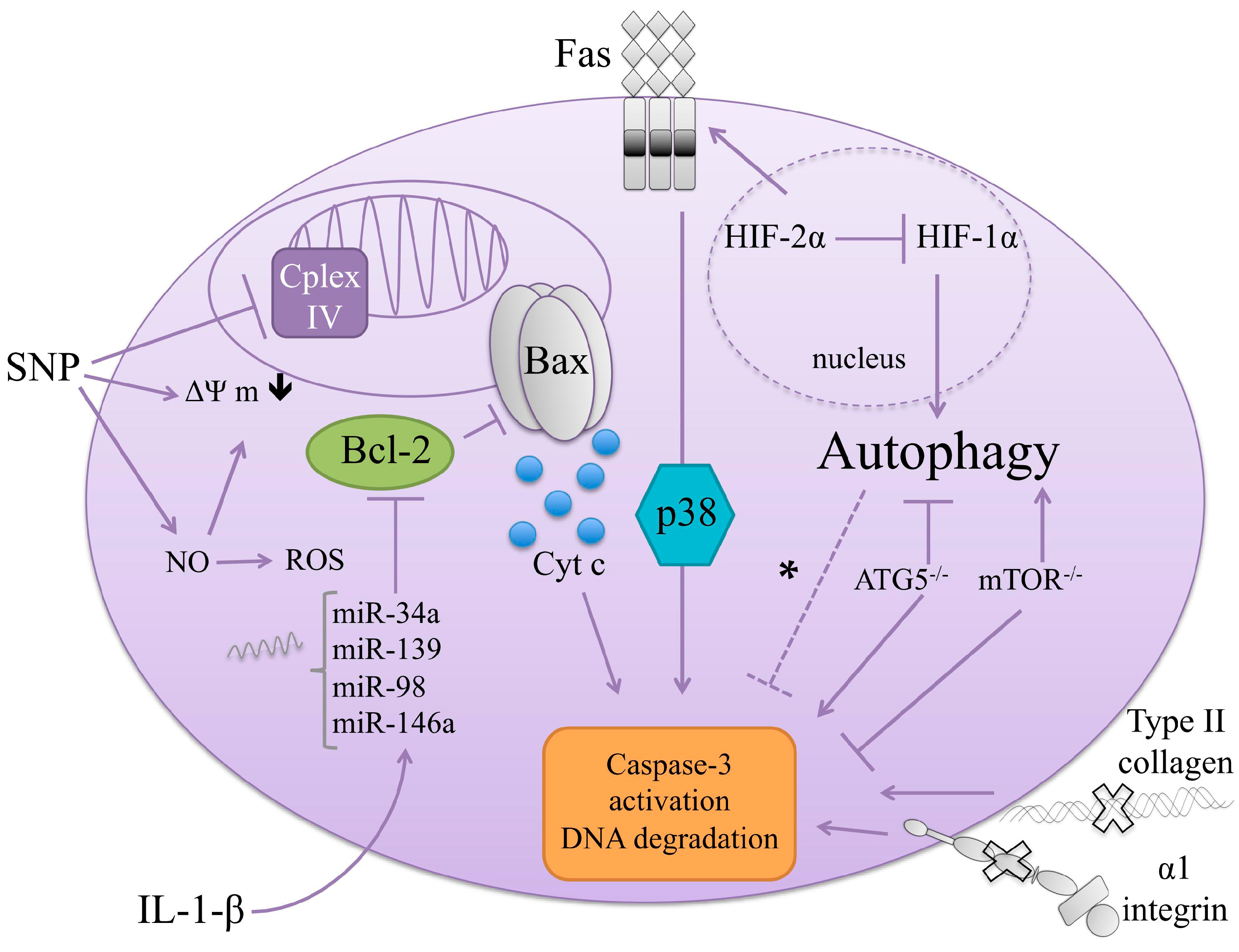 The apoptosis signaling events leading to cell death after SNP treatment in chondrocytes usually involves mitochondrial perturbation, such as reduction of mδΨ and Complex IV activity [72], release of cyt c and AIF, cleaved Bid mitochondrial translocation [231], Bax and Bak activation [226], as well as blockage of respiration and ATP generation in human articular chondrocytes and TC28 cells [232] and rabbit chondrocytes [233]. The latter studies suggested that mitochondrial perturbation could contribute to matrix loss and cartilage mineralization, or to the inhibition of cartilage matrix synthesis [232,233]. Interestingly, glucose level seems to also play a role in SNP-induced apoptosis. Indeed, although Maneiro et al. showed that SNP-induced apoptosis via specific inhibition of Complex IV, the inhibition of this complex (by NaN3) alone was not able to induce apoptosis unless it was in association with glucose deprivation. Dependence on glucose levels for SNP-induced apoptosis was also underline by de Andres et al., showing that the percentage of cell death after SNP treatment decreased as glucose concentration increased [227]. This dependence on glucose was not observed with another NO donor, NOC12 [227].