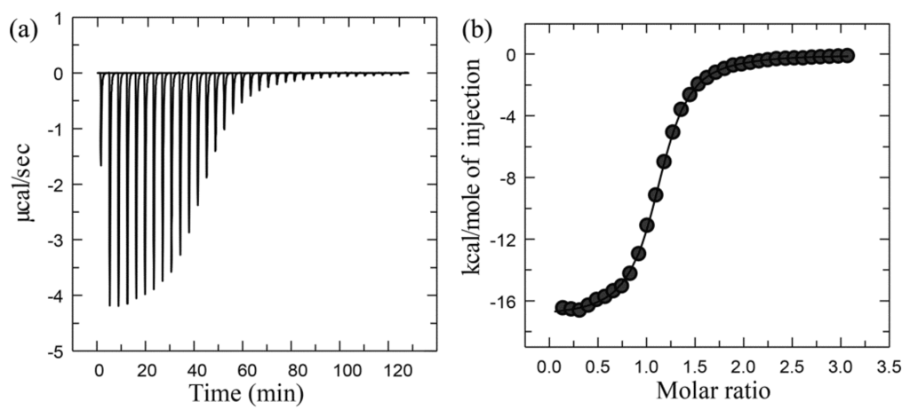 A typical ITC experiment contains three steps: (i) a ligand is titrated into a solution containing the bio-macromolecule (e.g., protein) of interest; (ii) the heat released or absorbed that is associated with a binding event is measured; and (iii) the primary ITC data is processed and fitted to obtain the binding constant (Kb), Gibbs free energy of binding (ΔG), binding enthalpy (ΔH) and entropy (ΔS), and the stoichiometry (n) of the binding event [110]. Moreover, when ITC experiments are performed at varying temperatures, the heat capacity change (ΔCp) of a binding reaction can be obtained.