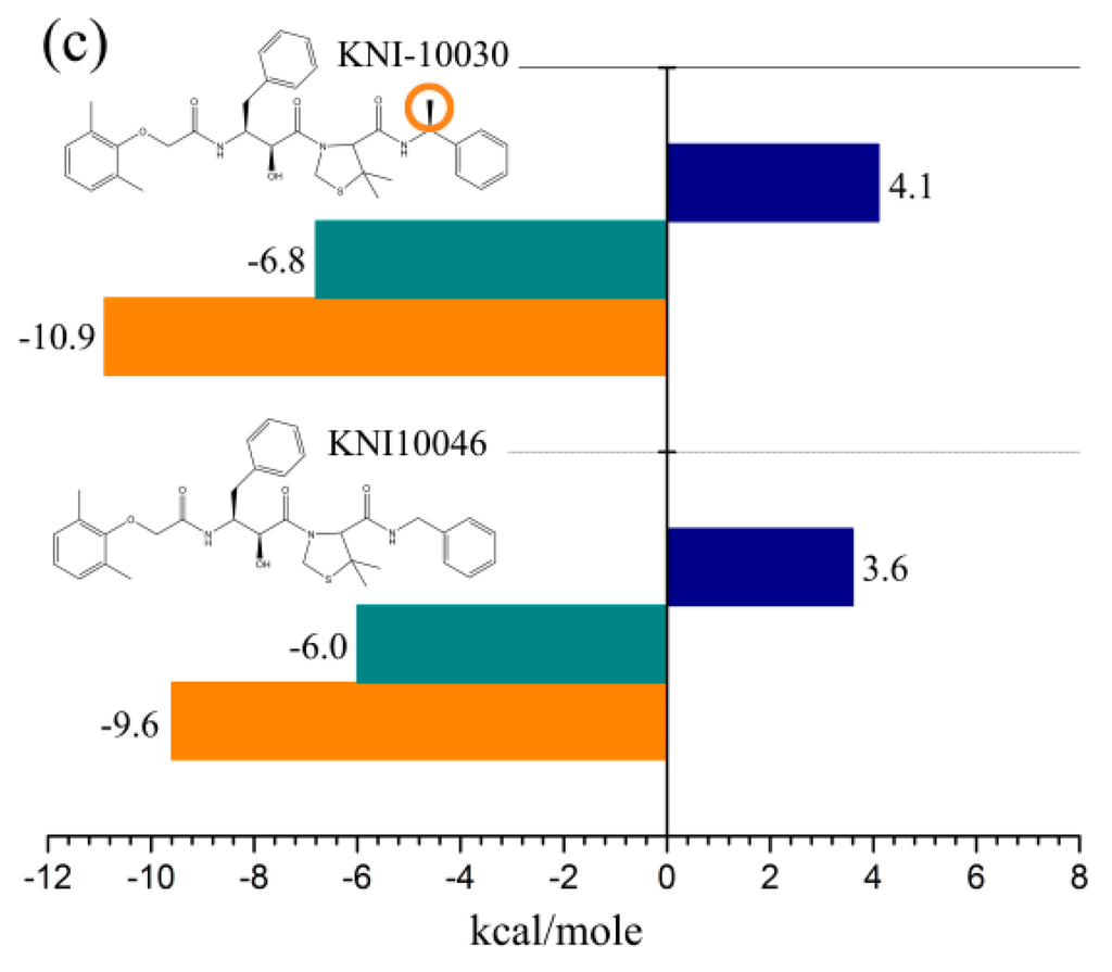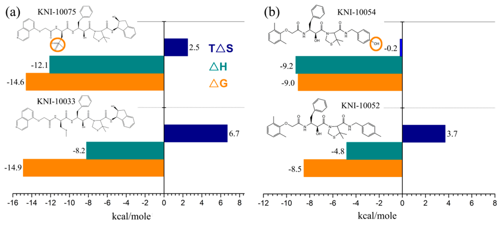 Freire laboratory has performed a series of studies to optimize HIV-1 proteinase inhibitor binding by consideration of the thermodynamics of the binding interactions [123,124,125,126,127,128]. Figure 3 shows the thermodynamic profiles for three pairs of HIV-1 proteinase inhibitors, with the difference in each pair being merely a single functional group. For the first pair [127] (Figure 3a), the replacement of a thioether on KNI-10033 by a sulfonyl on KNI-10075 results in a more negative enthalpy change (by −3.9 kcal·mol−1) but a less entropy gain (by −4.2 kcal·mol−1), thus ultimately elevating the binding free energy by 0.3 kcal·mol−1. These results indicate that although the addition of a single polar group introduces a strong hydrogen-bonding interaction with the target, the quantity of the decreased enthalpy cannot overcome that of the decreased entropy, resulting in a small rise in binding affinity. For the second pair [127] (Figure 3b), the replacement of a methyl group (KNI-10052) by a hydroxyl group (KNI-10054) results in a more negative enthalpy change of −4.4 kcal·mol−1, which is large enough to overcompensate for the entropic decrease (−3.9 kcal·mol−1), ultimately resulting in a slight lowering of the binding free energy (−0.5 kcal·mol−1). However, such a small free energy lowering corresponds to a large increase in binding affinity by a factor of 2 [122]. These results indicate that if the negative enthalpy change resulting from the introduction of a polar group is large enough, it is possible to overcome the entropic loss and increase the binding affinity. For the third pair [128] (Figure 3c), the addition of a methyl group to KNI-10046 results in a lower free energy of KNI-10030 (−10.9 kcal·mol−1) than its precursor (−9.6 kcal·mol−1). This is caused by more favorable enthalpy (by −0.8 kcal·mol−1) and entropy (by 0.5 kcal·mol−1) contributions of KNI-10030 compared to those of KNI-10046. These results indicate that the introduction of an apolar group brings about both the favorable changes in the enthalpy and entropy, thus resulting in 8.7-fold higher binding affinity but a more hydrophobic compound. Nevertheless, the highly hydrophobic compounds have been recognized to have problems with solubility, bioavailability, and selectivity [122]. On the contrary, the more hydrophilic compounds likely have better physicochemical parameters such as the lipophilicity and solubility that are necessary for favorable enthalpic binding [129]. Although the enthalpy-driven optimization is more challenging compared to the entropy-driven optimization, the development of enthalpically optimized compounds is becoming a trend for drug design [122,125,129].