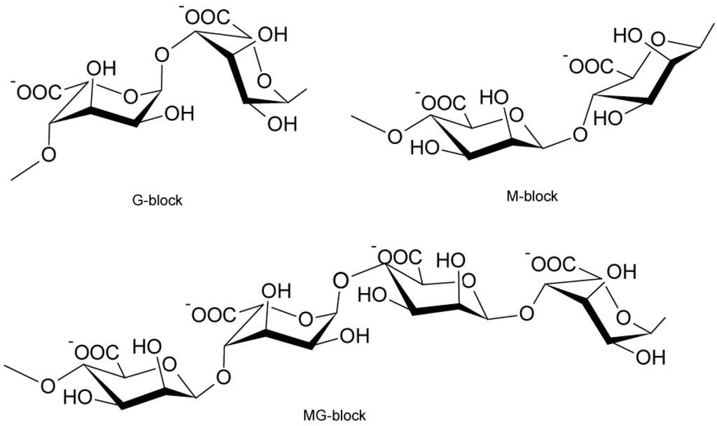 Structure of alginate [3]. G-block: guluronic acid residues; M-block: mannuronic acid residues; MG-block: alternating mannuronic acid and guluronic acid residues.