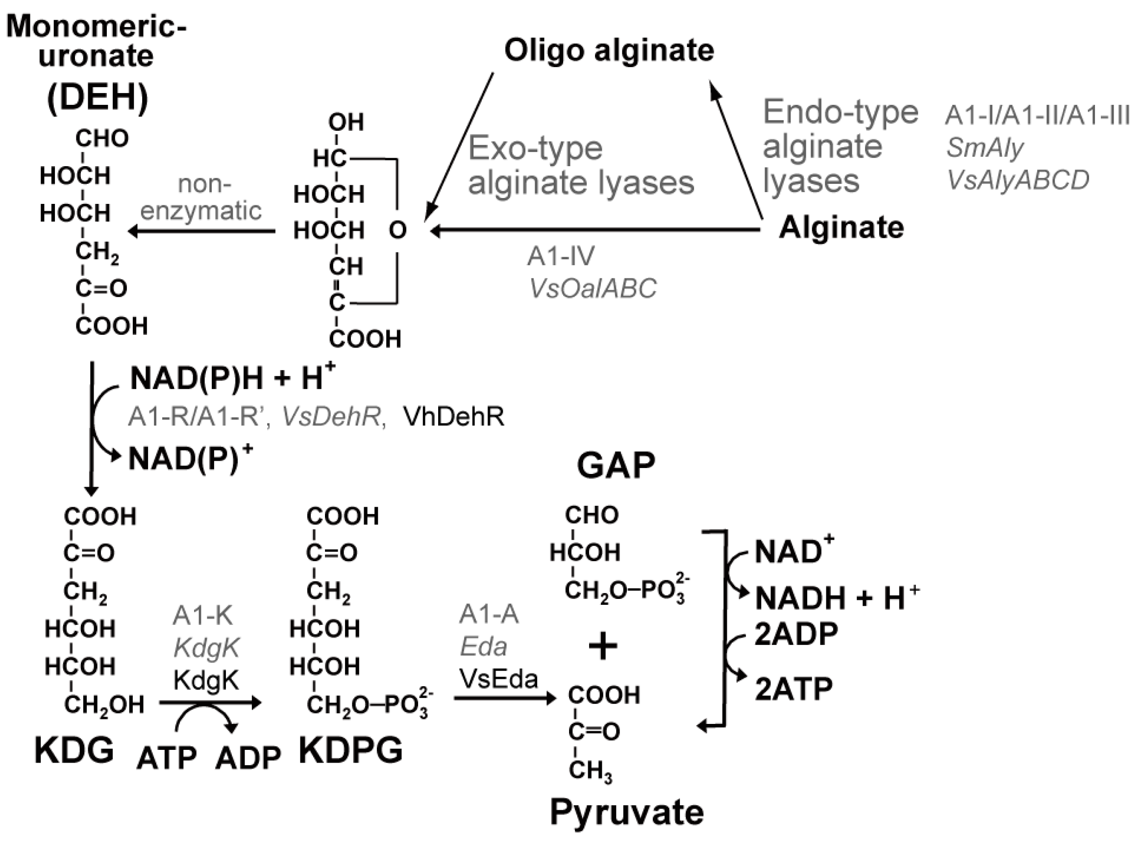 Alginate metabolism. Enzymes present in Sphingomonas sp. A1 [31,36,37] are in roman gray; those present or introduced in bioengineered E. coli [18] are shown in gray italics; and those introduced in bioengineered S. cerevisiae [20] are shown in black. The bioengineered S. cerevisiae assimilates 4-deoxy-l-erythro-5-hexoseulose uronate (DEH), but not alginate [20]. Details are described in the text. KDG: 2-keto-3-deoxy-d-gluconate; KDPG: 2-keto-3-deoxy-phosphogluconate; GAP: glyceraldehyde-3-phosphate; VhDehR: V. harveyi DehR; VsOalABC: V. splendidus 12B01 OalABC; SmAly: Pseudoalteromonas sp. SM0524 Aly; VsSlyABCD: V. splendidus 12B01 SlyABCD; VsEda: V. splendidus 12B01 Eda.