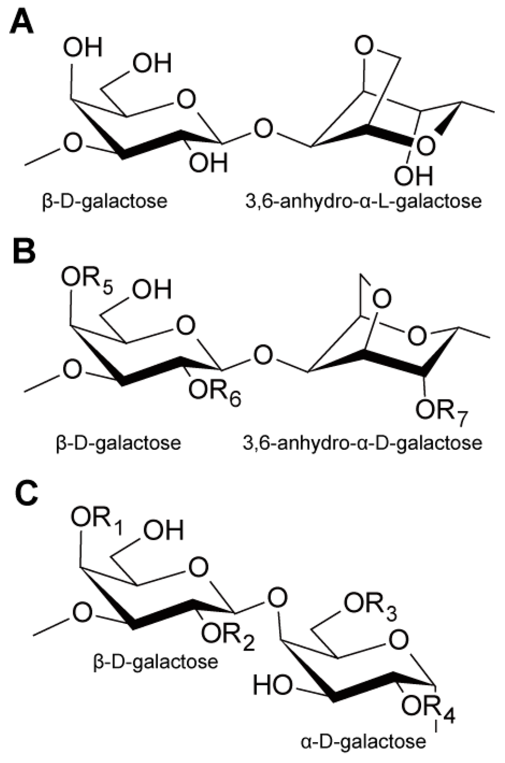 (A) Structure of the repeating disaccharide units in agarose; (B) structure of the repeating disaccharide units in kappa-carrageenan (R6 = R7 = H, R5 = SO3−), iota-carrageenan (R6 = H, R5 = R7 = SO3−) and theta-carrageenan (R5 = H, R6 = R7 = SO3−); (C) structure of the repeating disaccharide units in mu-carrageenan (R2 = R4 = H, R1 = R3 = SO3−), nu-carrageenan (R2 = H, R1 = R3 = R4 = SO3−) and lambda-carrageenan (R1 = H, R2 = R3 = R4 = SO3−) [3].