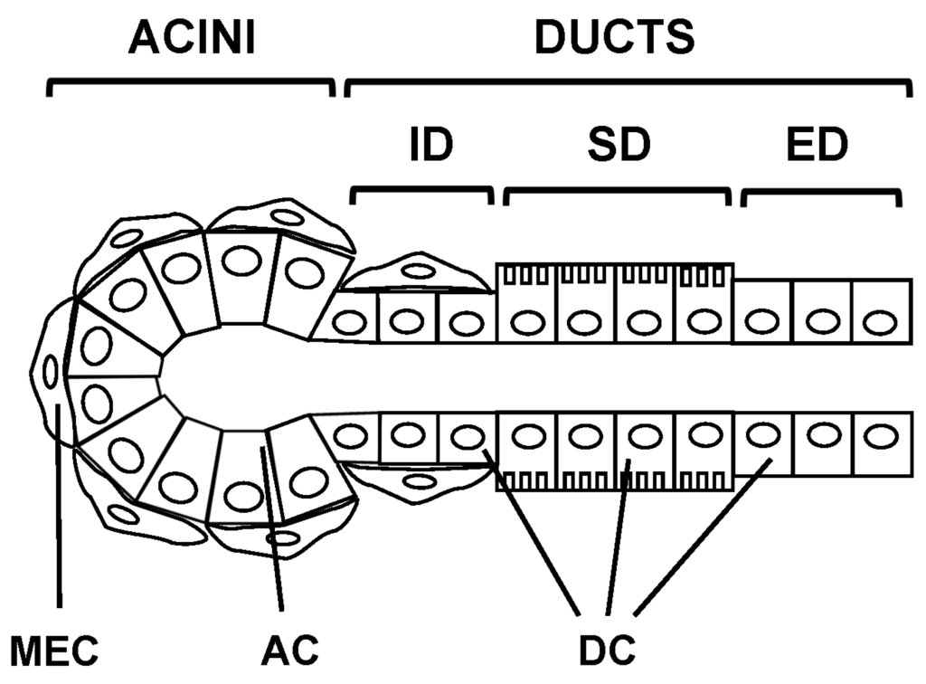 - He, X.; Tse, C.M.; Donowitz, M.; Alper, S.L.; Gabriel, S.E.; Baum, B.J. Polarized distribution of key membrane transport proteins in the rat submandibular gland. Pflug. Arch. 1997, 433, 260–268. [Google Scholar] [CrossRef]