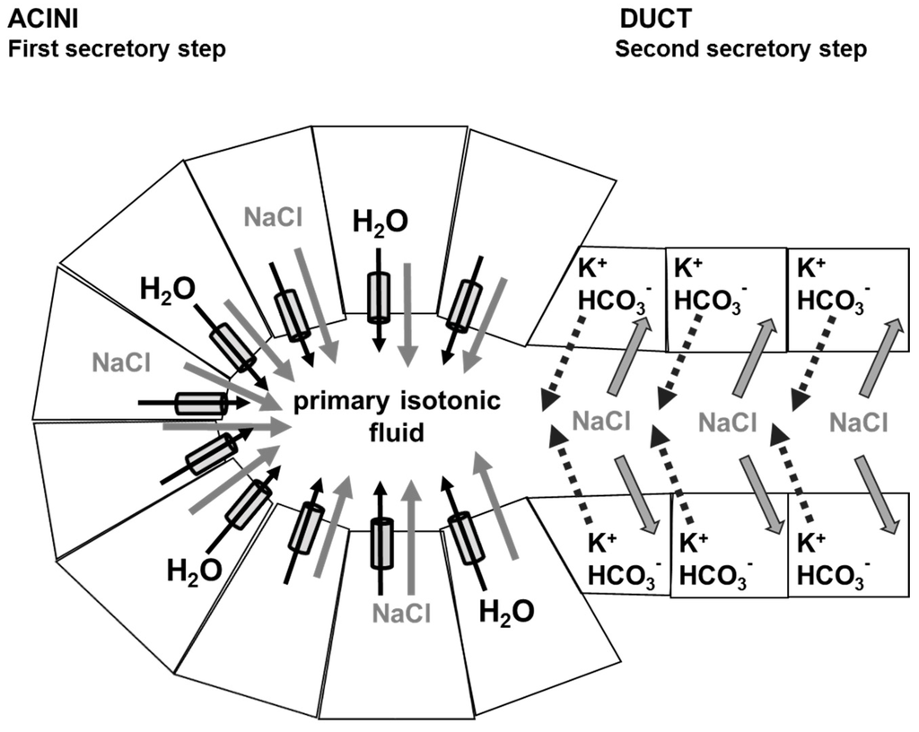 - Lee, M.G.; Ohana, E.; Park, H.W.; Yang, D.; Muallem, S. Molecular mechanism of pancreatic and salivary gland fluid and HCO3 secretion. Physiol. Rev. 2012, 92, 39–74. [Google Scholar] [CrossRef] [PubMed]