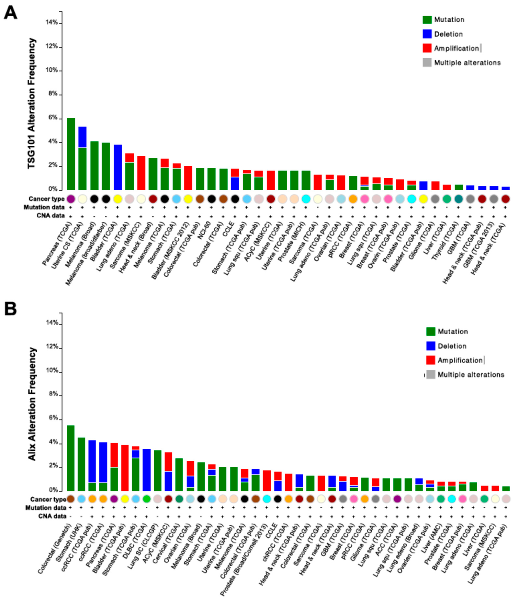 Genomic alterations of Tsg101 and ALIX in cancer. Frequency of copy number alterations and mutations of Tsg101 (A); and ALIX (B) across several tumor types. The results shown here are based upon data generated by the TCGA Research Network (Available online: http://cancergenome.nih.gov/).