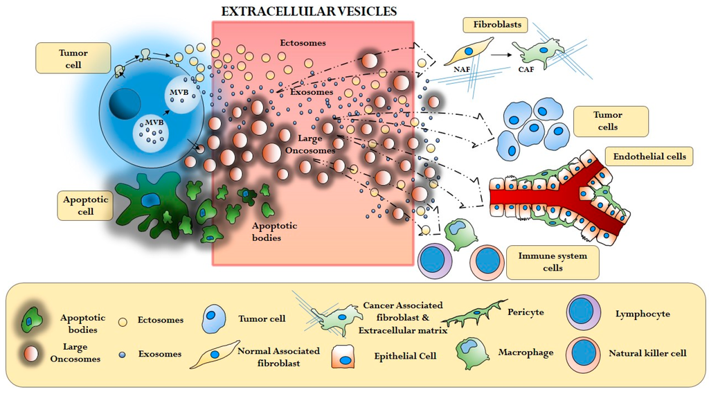 Apoptotic bodies (ABs) are particles of relatively large size (1–4 µm), released by tumor cells and other cell types upon the trigger of the cellular collapse that results in karyorrhexis (nuclear fragmentation), increase in membrane permeability, and externalization of phosphatidylserine (PS) [41,42]. Apoptotic membrane blebbing is a well-studied phenomenon that occurs during the late stages of programmed cell death, and is the result of caspase-mediated cleavage and consequent activation of ROCK1 [43]. It has been reported that ABs contain nuclear material, which might be functional. However, the results suggesting that ABs, through the horizontal transfer of oncogenes from cancer to recipient cells, participate in cancer development [44] needs further investigation in vitro and possibly in vivo [45]. Importantly, although an exchange of cancer-derived DNA has been reported in prostate cancer cells [46], whether this mechanism has functional consequences is still unknown. Another role suggested for ABs is that they can act by “dispatching suicide notes” to the surrounding environment. In fact, in early phases of apoptosis, AB membranes display increased permeabilization, allowing them to release proteins into the microenvironment. This, in turn, prepares the surrounding cells for the catastrophic loss of membrane integrity that affects apoptotic cells during secondary necrosis [47].