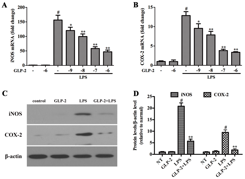 Glucagon-like peptide-2 (GLP-2) attenuates lipopolysaccharide (LPS)-induced iNOS and COX-2 in BV-2 cells. (A,B) The mRNA expression of iNOS and COX-2. BV-2 cells were pretreated with GLP-2 (10−9, 10−8, 10−7, and 10−6 M) 1 h prior to incubation of LPS (1 μg/mL) for 4 h; (C,D) Western blotting analysis of iNOS and COX-2. BV-2 cells were pretreated with 10−6 M GLP-2 for 1 h followed by LPS treatment at 1 μg/mL for 4 h. The mRNA and protein levels of iNOS and COX-2 normalized to β-actin. Each value was then expressed to non-treated (NT) control group, which was set as 1.00. Results are expressed as mean ± SD for each group from three independent experiments. # Significant compared with NT, p < 0.05; * p < 0.05 and ** p < 0.01 versus the GLP-2-untreated LPS-stimulated group.