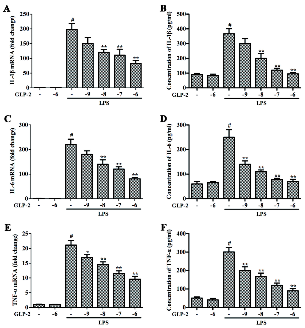 Effects of GLP-2 on LPS-induced expression of proteins and mRNA for IL-1β, IL-6 and TNF-α in BV-2 cells. BV-2 cells were pretreated with GLP-2 (10−9, 10−8, 10−7, and 10−6 M) 1 h prior to incubation of LPS (1 μg/mL) for 4 h (mRNA) or 24 h (protein). Proteins and mRNA of IL-1β (A,B); IL-6 (C,D) and TNF-α (E,F) were determined by quantitative real-time PCR and ELISA. Results are expressed as mean ± SD for each group from three independent experiments. # Significant compared with control (NT) alone, p < 0.05; * p < 0.05 and ** p < 0.01 versus the GLP-2-untreated LPS-stimulated group.