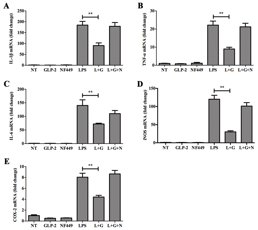 Effects of GLP-2 mediated by Gαs signaling pathway. BV-2 cells were pretreated with vehicle or NF449 for 1 h. Medium was removed and replaced with vehicle, GLP-2 (10−6 M), NF449 (10 μM), LPS (1 μg/mL), LPS + GLP-2 (L + G), or LPS + GLP-2 + NF449 (L + G + N). BV-2 cells were sampled at 4 h. The mRNA of pro-inflammatory enzymes and pro-inflammatory cytokines were determined by quantitative real-time PCR. Attenuation by GLP-2 of LPS-induced mRNA of IL-1β (A); TNF-α (B); IL-6 (C); iNOS (D); and COX-2 (E) from BV-2 cells; this effect is abolished by pretreatment with NF449, ** p < 0.01.