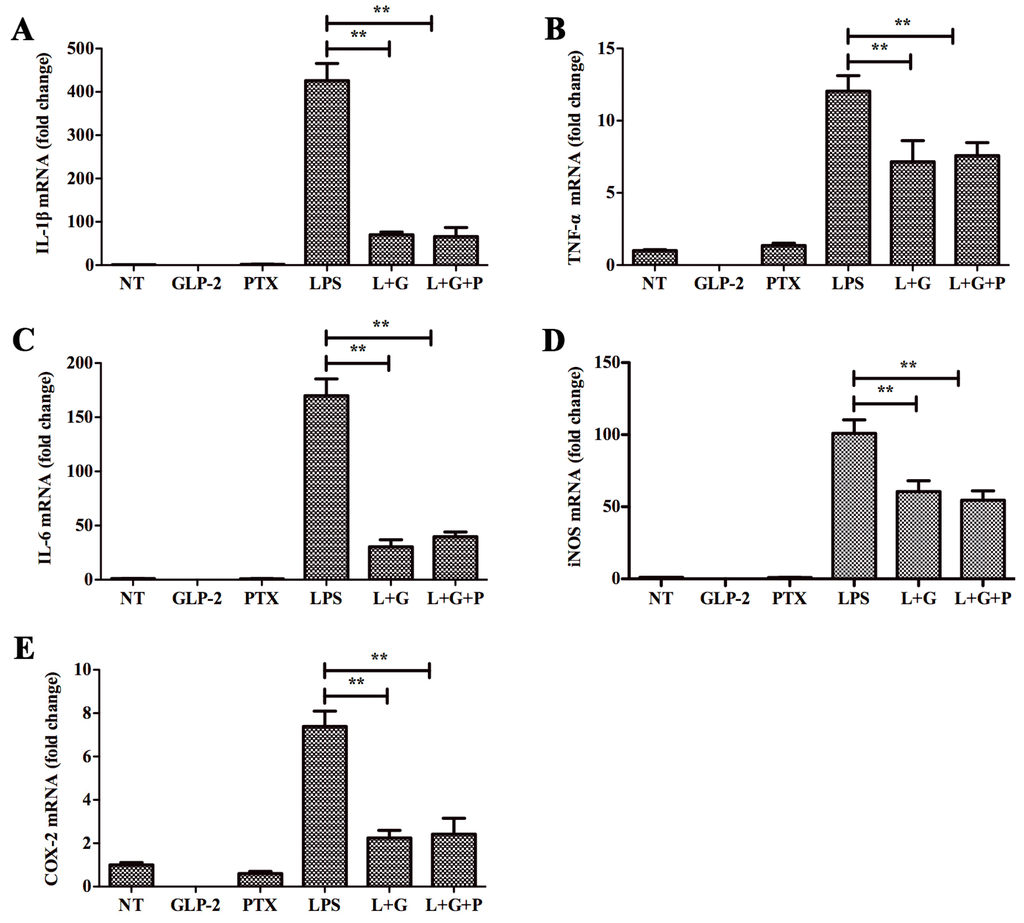 Effects of GLP-2 did not mediate by Gαi/o signaling pathway. BV-2 cells were pretreated with vehicle or PTX for 1 h. Medium was removed and replaced with vehicle, GLP-2 (10−6 M), pertussis toxin (PTX) (100 ng/mL), LPS (1 μg/mL), LPS + GLP-2 (L + G), or LPS + GLP-2 + PTX (L + G + P). BV-2 cells were sampled at 4 h. The mRNA of pro-inflammatory enzymes and pro-inflammatory cytokines were determined by quantitative real-time PCR. Attenuation by GLP-2 of LPS-induced mRNA of IL-1β (A); TNF-α (B); IL-6 (C); iNOS (D); and COX-2 (E) from BV-2 cells; this effect is not abolished with pretreatment with PTX, ** p < 0.01.