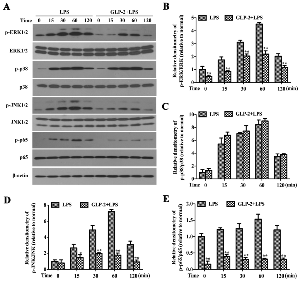 Effects of GLP-2 on LPS-induced activation of MAPKs and NF-κB in BV-2 cells. BV-2 cells were pretreated with GLP-2 (10−6 M) for 1 h followed by the treatment of LPS (1 μg/mL) for 0, 15, 30, 60 and 120 min. (A) Representative images of Western blotting for the phosphorylation of ERK1/2 (B); p38 (C); JNK1/2 (D) and NF-κB p65 (E). The activated levels of ERK1/2, p38, JNK1/2 and NF-κB p65 were quantified and normalized with their respective total protein. Each value was then expressed to control (LPS alone for 0 min), which was set as 1.00. * p < 0.05 and ** p < 0.01 versus treated with LPS alone within the same time point. Results are expressed as mean ± SD for each group from three independent experiments.