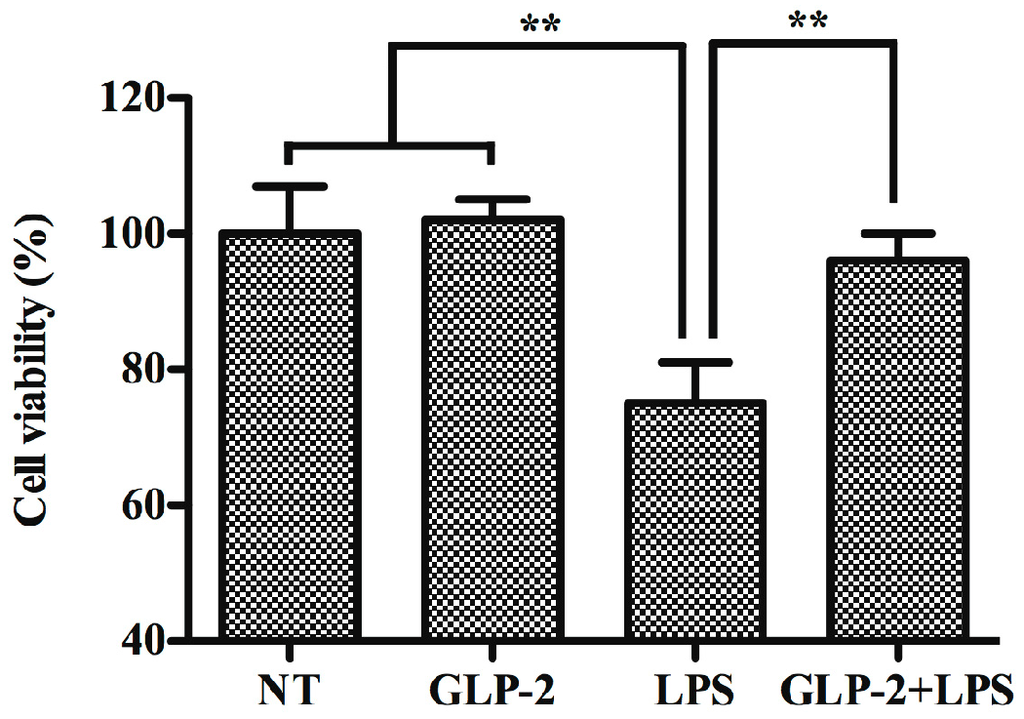 Effects of GLP-2 on microglia-mediated neurotoxicity. BV-2 cells were first treated with LPS (1 μg/mL) for 24 h in the presence or absence of GLP-2 (10−6 M). Then, the media were collected as conditioned media and added to PC12 cells. After 24 h, cell viability of PC12 cells was examined by MTT assay. Each value was then expressed as percentage of the control. The control group (NT) was set to 100%. ** p < 0.01. Results are expressed as mean ± SD for each group from three independent experiments.