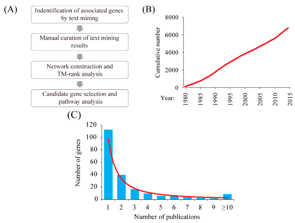 Systematic identification of susceptibility genes for ectopic pregnancy. (A) Overview of the experimental design; (B) Cumulative number of publications related to ectopic pregnancy by year (from 1980 to 2015); (C) Distribution of the number of publications per gene.