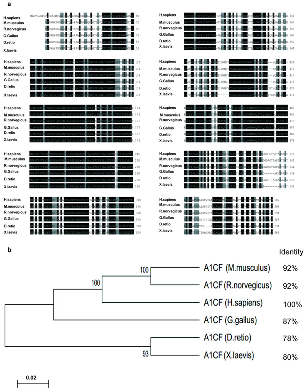Apobec-1 complementation factor (A1CF) is highly conserved among species. (a) A1CF amino acid sequences of human, mouse, rat, chicken, zebrafish, xenopus laevis were selected to analysis. The identical amino acids were shaded in black and the similar amino acids in grey; (b) Phylogenetic tree of A1CF amino acids is constructed using MEGA6 software, bootstrap percentages based on 1000 replicates, are shown on each branch. Identity values are listed on the right ranging from 78% to 92%, revealing that A1CF is highly conserved among species.
