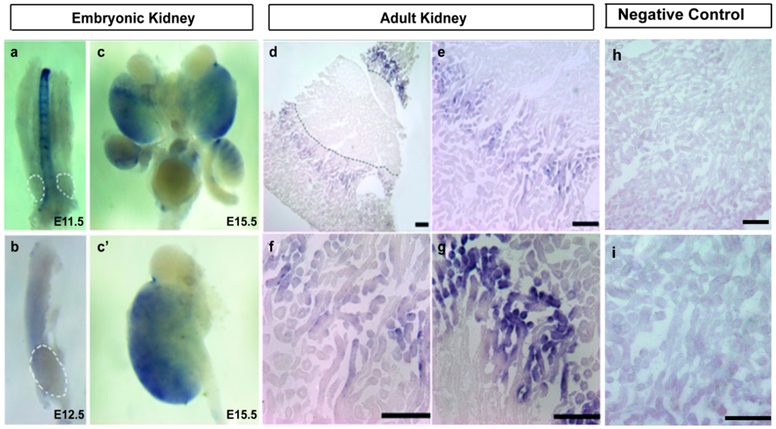 Previous study shows that A1CF is expressed in mammalian kidney [9]. To explore dynamic changes of its expression in kidney development, C57BL/6 mouse kidney of embryonic day 11.5 (E11.5d), embryonic day 12.5 (E12.5d) and embryonic day 15.5 (E15.5d) were selected to do whole mount in situ hybridization. We also separated adult C57BL/6 mouse kidney for section in situ hybridization to investigate its tissue localization. Results showed that the expression of A1CF in E11.5d, E12.5d was barely detected (Figure 2a,b). However, in E15.5d, we found that A1CF was weakly expressed (Figure 2c,c′), and the expression of A1CF in adult mouse kidneys were obvious (Figure 2d). We also found in the adult kidney of C57BL/6 mouse, A1CF was not expressed in the other parts of the kidney section but mainly in the tubules of inner cortex (Figure 2d–g). No hybridization signal can be detected when sense probes were used in control groups (Figure 2h,i). Taken together, our data demonstrated that A1CF is expressed in mouse kidneys starting at E15.5d and centers on the kidney tubules in adult mouse kidneys.