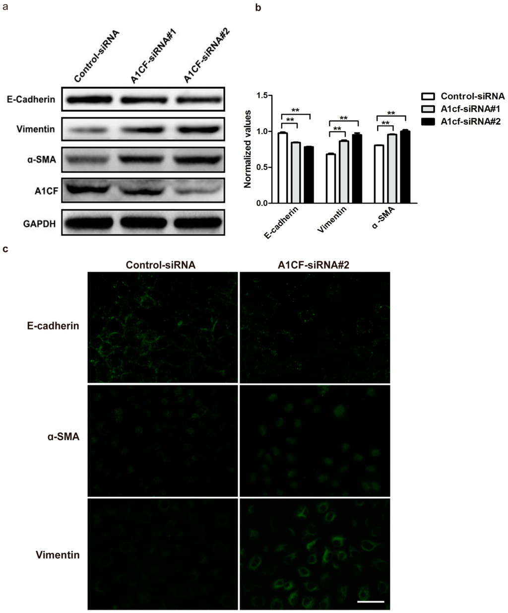 A1CF knockdown induces EMT. (a) Control-siRNA, A1CF-siRNA #1, and A1CF-siRNA #2 were transfected into NRK52e cells. Western blotting analysis reveals a decrease in E-cadherin (epithelial marker) and concomitant increase in vimentin and α-SMA (mesenchymal markers). GAPDH served as loading control; (b) Statistical analysis of relative protein expression levels, Data (mean ± S.E.M.) are representative of three independent experiments. ** p ≤ 0.01 indicates highly statistically significant differences compared with control-siRNA group; (c) A1CF-siRNA #2 was transfected into NRK52e cells. A1CF knockdown attenuates the expression of membrane E-cadherin and potentiates the expression of α-SMA and vimentin demonstrated by immunofluorescence analysis (original magnification, ×40). Scale bar represents 50 µm.