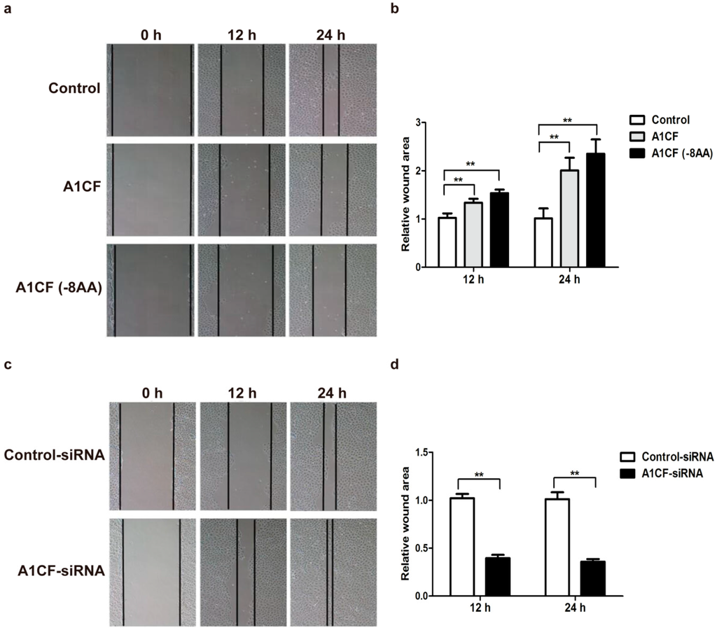 To further verify the possible correlation of A1CF and EMT. Scratch wound healing assay was employed to investigate the function of A1CF in the process of EMT. NRK52e cells were treated with pCMV-A1CF, pCMV-A1CF (-8AA) and pCMV-flag. As showed in Figure 5a, overexpression of A1CF and A1CF (-8AA) both significantly inhibited the migration ability of NRK52e cells compared to control group. The quantification was analyzed by NIH Image J software, and shown in Figure 5b. In addition, NRK52e cells were also treated by either A1CF-siRNA #2 or Control-siRNA. It was observed that A1CF knockdown remarkably enhanced migration ability of NRK52e cells (Figure 5c). The corresponding quantification was shown in Figure 5d. Thus, our results indicate A1CF inhibits the migration ability of NRK52e cells.