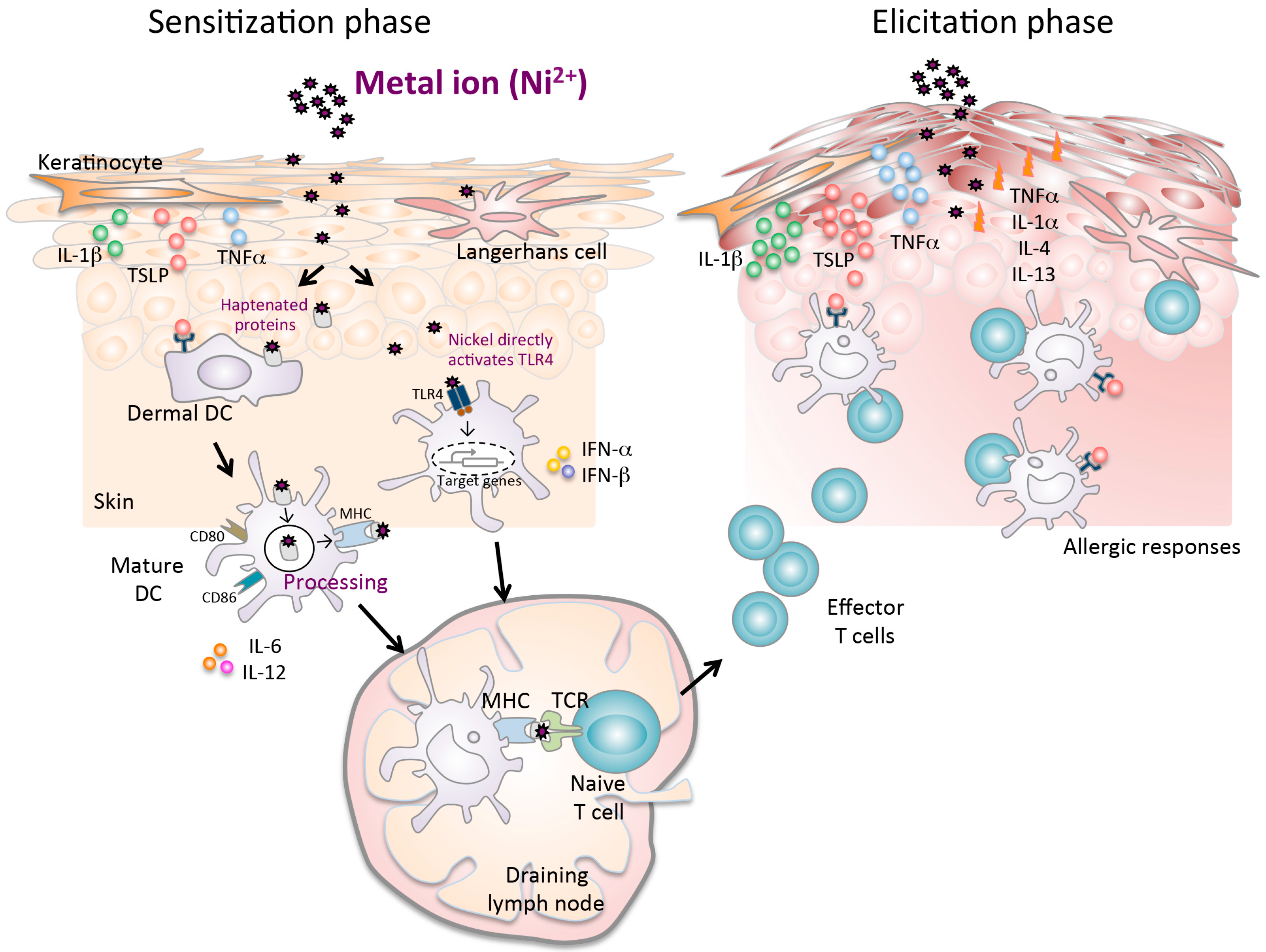 A complex mechanism of metal allergy. The sensitization phase begins after nickel exposure to the skin. Nickel penetration into the skin results in the production of proinflammatory cytokines (TNF-α and IL-1β), TSLP, and chemokines, which induce activation and migration of haptenated protein-loaded epidermal and dermal DCs through afferent lymph to the draining lymph nodes. Particularly in humans, nickel directly activates the TLR4 pathway in DCs. In the draining lymph nodes, haptenated-peptide presentation results in the proliferation, activation and subsequent differentiation of hapten-specific T cells. Secretion of cytokines in the draining lymph nodes during the sensitization phase contributes to efficient hapten-specific T cell activation, proliferation, and differentiation. At the end of this phase, primed specific T cells migrate out of the lymph nodes to the skin. In the elicitation phase, the subsequent application of the same hapten leads to uptake by cells, which is presented to the recirculating hapten-specific T cells. The activated T cells produce inflammatory cytokines and chemokines at the site of exposure that promote an allergic reaction, leading to the development of characteristic skin lesions.