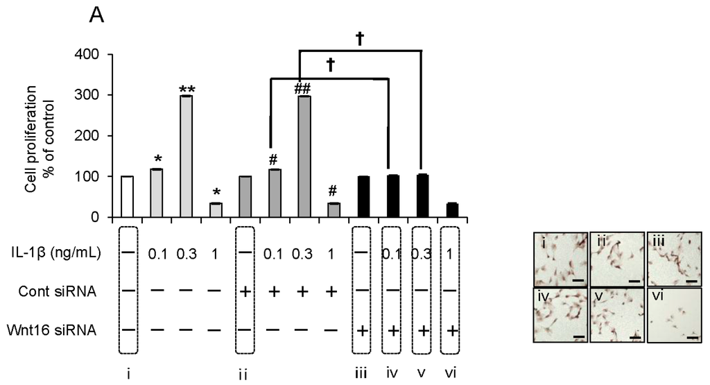Effect of Wnt16, Lrp5, and MMP-13 siRNAs on IL-1β-induced cell proliferation. (A–C) α7+hSMSC-OB cells were transfected for 24 h with Wnt16, Lrp5, and MMP-13 siRNAs, stimulated with IL-1β (0, 0.1 0.3, and 1 ng/mL), and then analyzed by the BrdU-cell proliferation ELISA (graphs) and BrdU immunohistochemistry kit (images, right row). * p < 0.01 vs. control; ** p < 0.01 vs. control; # p < 0.01 vs. control siRNA; ## p < 0.01 vs. control siRNA; † p < 0.01. The BrdU immunohistochemistry kit stains the nuclei of proliferating cells (dark brown). Images are representative of at least three independent experiments. Scale bars = 100 μm.