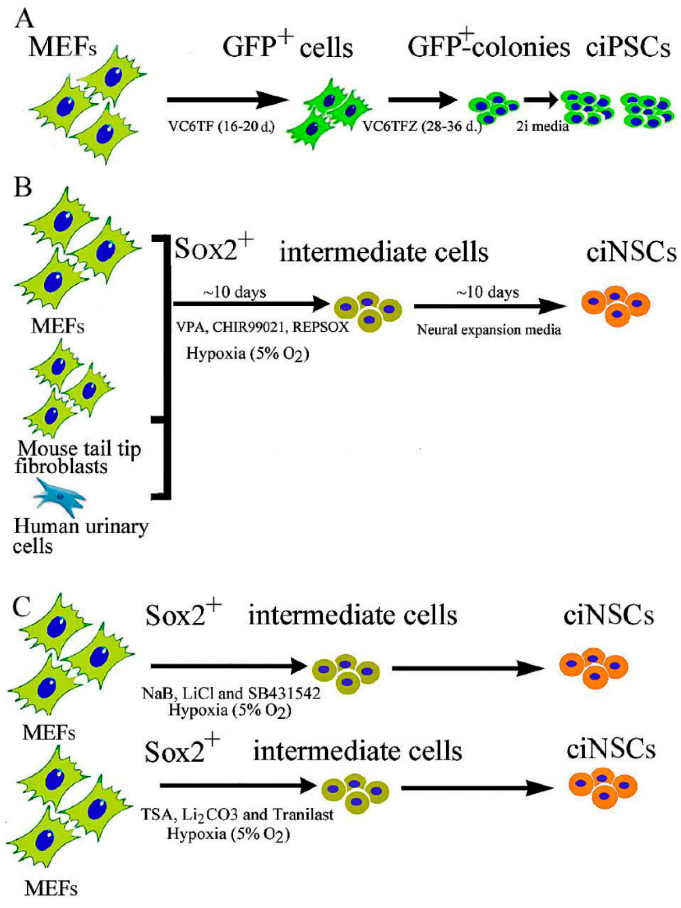 - Cheng, L.; Hu, W.; Qiu, B.; Zhao, J.; Yu, Y.; Guan, W.; Wang, M.; Yang, W.; Pei, G. Generation of neural progenitor cells by chemical cocktails and hypoxia. Cell Res. 2014, 24, 665–679. [Google Scholar] [CrossRef] [PubMed]