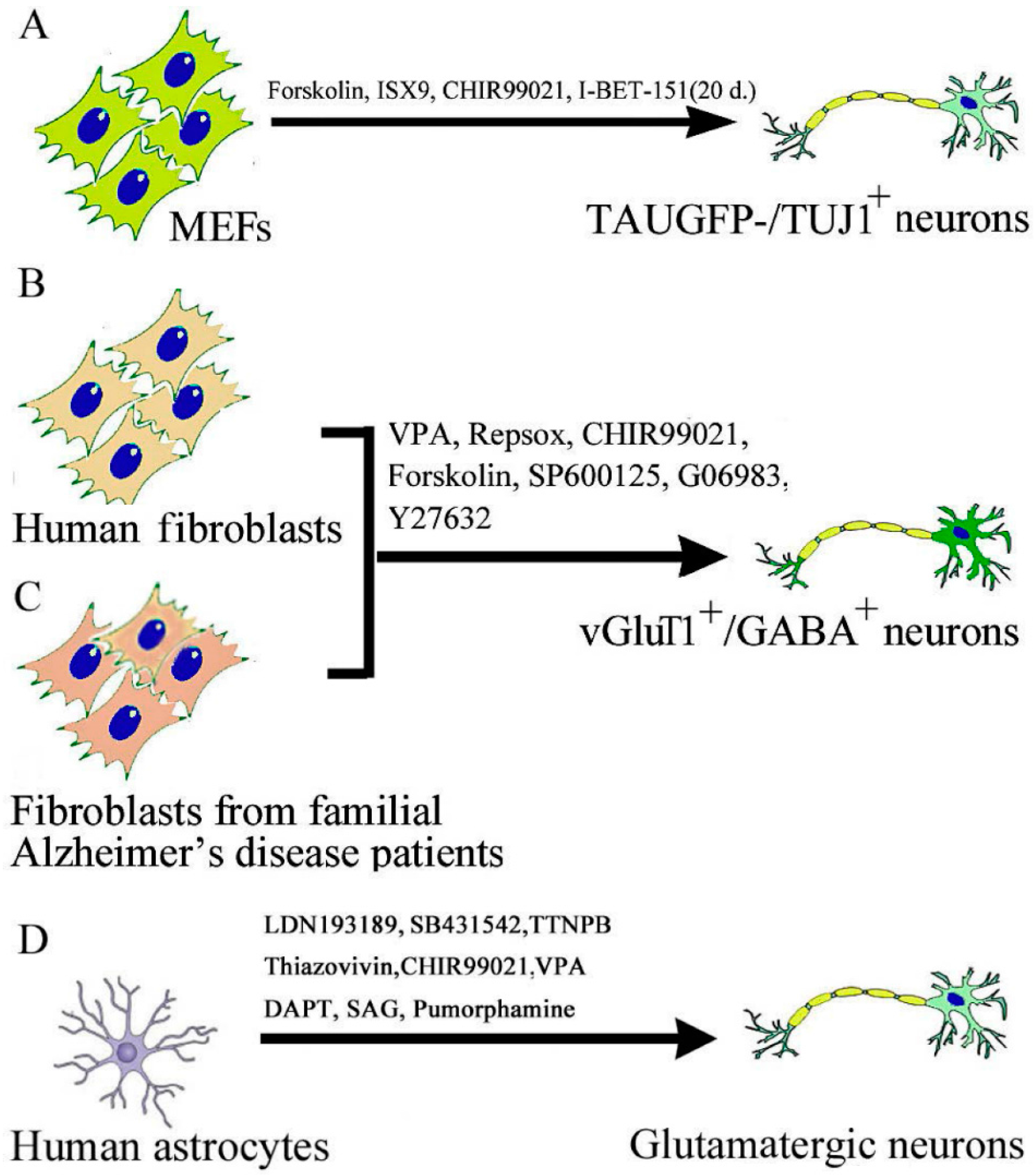 - Hu, W.; Qiu, B.; Guan, W.; Wang, Q.; Wang, M.; Li, W.; Gao, L.; Shen, L.; Huang, Y.; Xie, G.; et al. Direct conversion of normal and alzheimer’s disease human fibroblasts into neuronal cells by small molecules. Cell Stem Cell 2015, 17, 204–212. [Google Scholar] [CrossRef] [PubMed]
