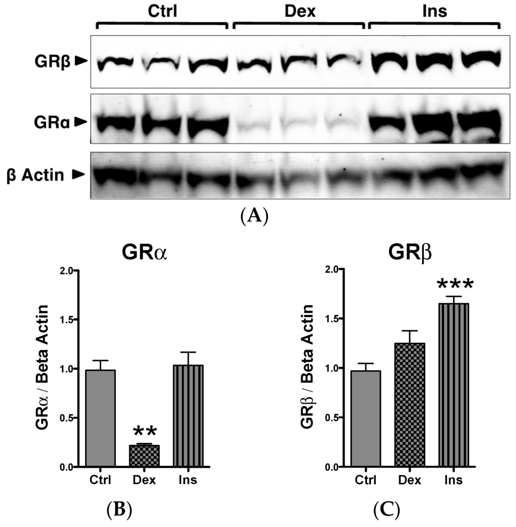 2.1. GRβ Responsiveness to Dexamethasone and Insulin