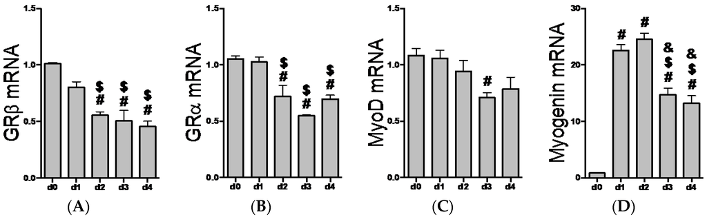 2.2. GR Isoform and Muscle Regulatory Factor mRNA Levels through Differentiation