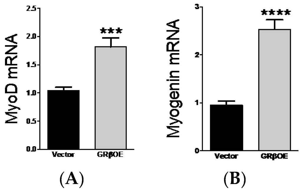 2.3. Overexpression of GRβ Increases Muscle Regulatory Factor mRNA Levels