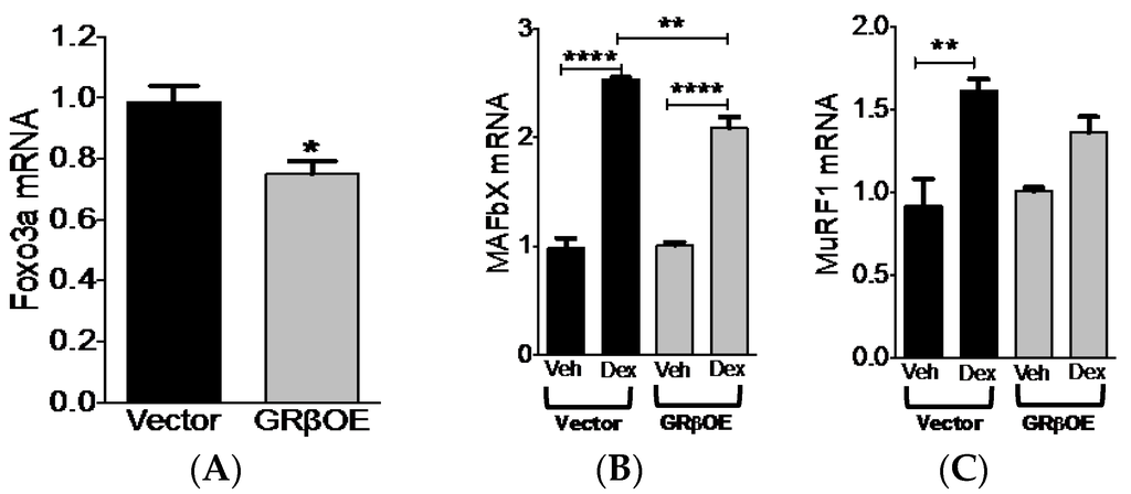 2.5. Overexpression of GRβ Blunts Dex-Induced Catabolic Gene Expression
